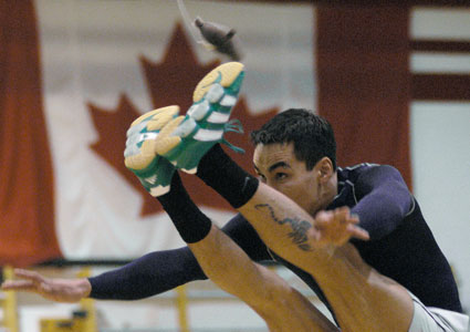 This seems to be true of all the AWG’s Inuit sports: They’re not about the athlete’s gear or their build. They’re about physical and mental grit. For this reason, they’re glorious to watch. And the viewer’s choice – requiring a delicate combination of strength, balance, grace and precision – is the high-kick. After watching 28-year-old Sean Nipisar from Nunavut’s Whale Cove, booting a sealskin ball suspended at ceiling-height seems perfectly reasonable. Nipisar is the obvious front-runner at both the one-foot and two-foot high-kicks (“foot” meaning the body part, not the distance). Tough-looking, with droopy eyes and the nose of a boxer, he can effortlessly vault into the air, jackknife his lanky frame so his toes are above his head, then punt the sealskin ball and land gracefully.