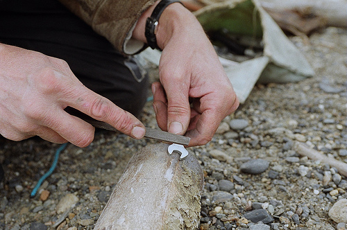 It turns out the problem is a fingernail-sized crescent of steel called a woodruff key, which helps with engine-cooling. Ours has been sheared, and without it we’re not going anywhere. Clayton chews his sandwich thoughtfully until struck by an idea. From his tool kit he pulls out an ordinary wrench, and begins hand-filing off one of the jaws, which is roughly the same shape and size as the woodruff key. After a half-hour of filing, the new key slides into the slot and the motor fires up. Out of giddy relief I start clapping. Nansi joins in and Clayton looks embarrassed. We pile into the canoe and push on in the lightly falling snow.