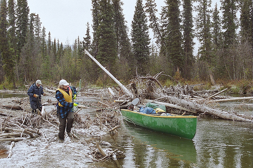 Barely a few kilometres on the water, we’re stopped by a thick tangle of trees that, over the years, have died slow, upright deaths and keeled into the river to be pushed around by currents and beavers. Clayton and Nansi hop out of the boat and survey the jumble. In their tall rubber boots and matching rain-gear they wander around like they’re in a department store, pointing, discussing, nodding.