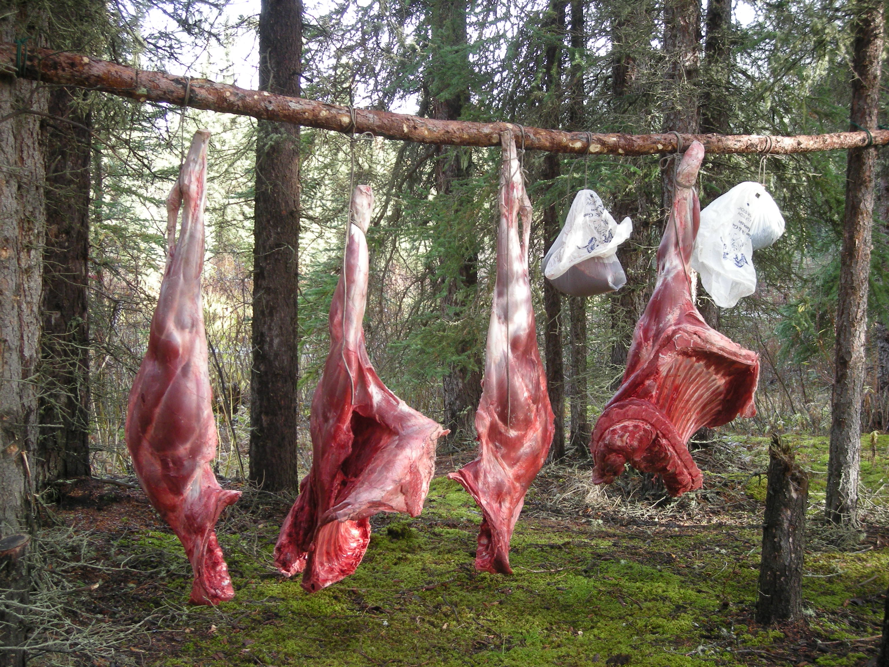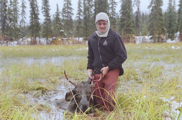Allowing only a few moments of emotional musing, Clayton gently reminds me that the moose must be skinned, gutted, carved and quartered before we lose our daylight, and we still have to haul it out of the water. To do it, Clayton and I wade shin-deep into the marsh and each take hold of an antler. Nansi is ahead, and will pull with ropes. We heave and ho the 300-kilo beast, creeping a few centimeters at a time. It’s exhausting work, like we’re dragging a sedan out of quicksand. Half an hour later we’ve managed to pull the carcass about 70 metres onto a drier patch of the slough where the field dressing can begin.