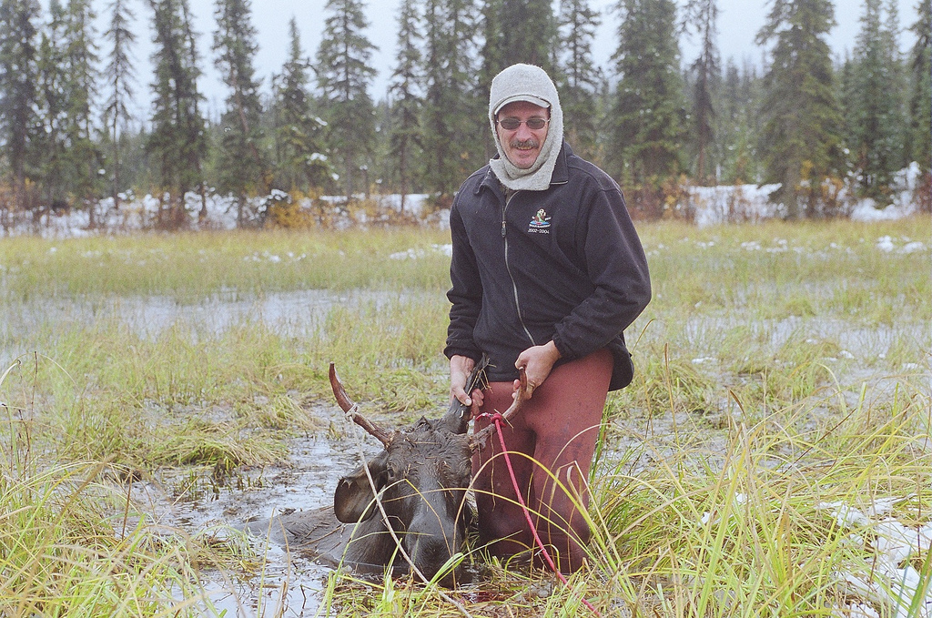When I see the moose up close I’m hit with another pang of grief. He’s young, his antlers just little branches, and his lidded eyes look through me like a drunk’s. Seeing him slumped there in the slough, I feel guilty and complicit in this sucker-punch slaying. Part of me knows these are reflexive, Bambi-inspired sentiments, the result of watching too many talking-animal movies. But part of me is still fixated on the loss of life.