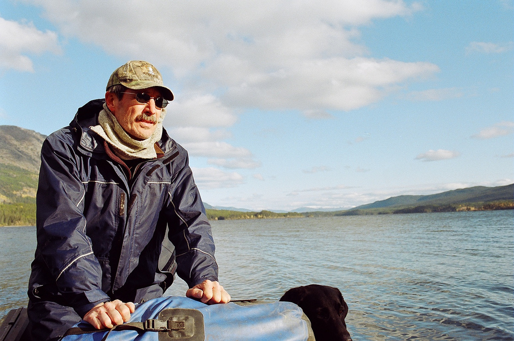 Day One on Quiet Lake, the source of the Big Salmon, is mercifully sunny, though a sharp, cold wind blasts through my wool layers. The six-metre freighter canoe – rebuilt by Clayton with, of course, cedar and canvas – is loaded with plastic bins, boxes, a cool waterproof chainsaw, a couple of rifles, and an excitable black lab named Gunner.