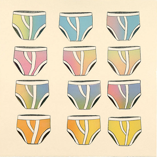 It was around this time when I saw my first Pootoogook drawing. I was in Yellowknife, working for Up Here, when the catalogue for the 2005 Dorset print collection landed on my desk. It included a Pootoogook print called “Briefcase,” a Warhol-esque checkerboard of colourful men’s briefs, which, in the context of the collection’s predictable Arctic imagery, was delightfully out of place.